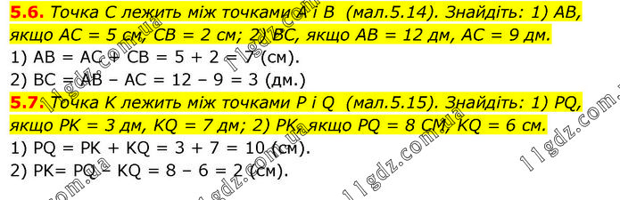 5.6. Точка C лежить між точками А і В (мал.5.14). Знайдіть: 1) AB, якщо AC = 5 см, CB = 2 см; 2) BC, якщо AB = 12 дм, AC = 9 дм. 1) АВ = АС + СВ = 5 + 2 = 7 (см). 2) ВС = АВ – АС = 12 – 9 = 3 (дм.) 5.7. Точка K лежить між точками P і Q (мал.5.15). Знайдіть: 1) PQ, якщо PK = 3 дм, KQ = 7 дм; 2) PK, якщо PQ = 8 CM, KQ = 6 см. 1) PQ = PK + KQ = 3 + 7 = 10 (см). 2) PK= PQ – KQ = 8 – 6 = 2 (см).