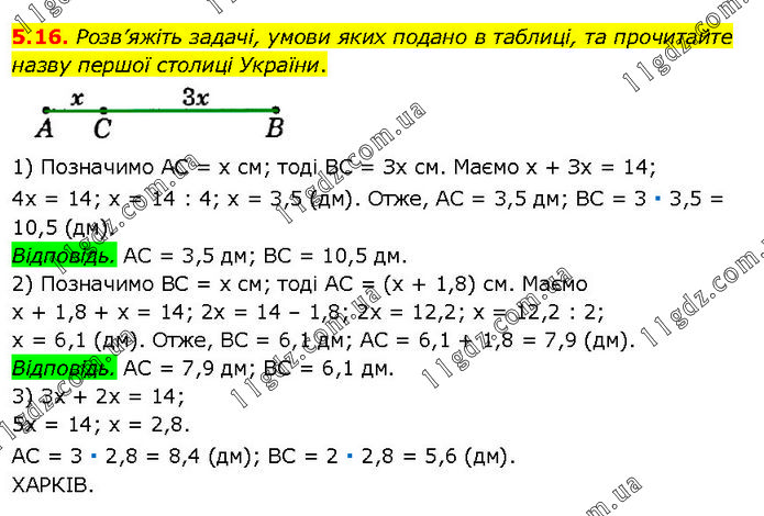 Розв’яжіть задачі, умови яких подано в таблиці, та прочитайте назву першої столиці України. 1) Позначимо AC = х см; тоді BC = Зх см. Маємо х + Зх = 14; 4х = 14; х = 14 : 4; х = 3,5 (дм). Отже, AC = 3,5 дм; BC = 3 ∙ 3,5 = 10,5 (дм). Відповідь. AC = 3,5 дм; BC = 10,5 дм. 2) Позначимо BC = х см; тоді AC = (х + 1,8) см. Маємо х + 1,8 + х = 14; 2х = 14 – 1,8; 2х = 12,2; х = 12,2 : 2; х = 6,1 (дм). Отже, BC = 6,1 дм; AC = 6,1 + 1,8 = 7,9 (дм). Відповідь. AC = 7,9 дм; BC = 6,1 дм. 3) 3х + 2х = 14; 5х = 14; х = 2,8. АС = 3 ∙ 2,8 = 8,4 (дм); ВС = 2 ∙ 2,8 = 5,6 (дм). ХАРКІВ.