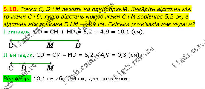 Точки С, D і M лежать на одній прямій. Знайдіть відстань між точками C і D, якщо відстань між точками C і M дорівнює 5,2 см, а відстань між точками D і M — 4,9 см. Скільки розв’язків має задача? I випадок. CD = CM + MD = 5,2 + 4,9 = 10,1 (см). II випадок. CD = CM – MD = 5,2 – 4,9 = 0,3 (см). Відповідь. 10,1 см або 0,3 см; два розв’язки.