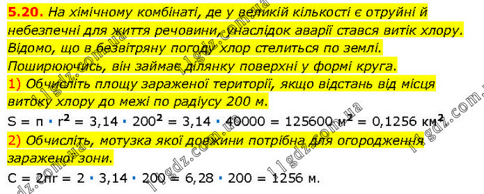 На хімічному комбінаті, де у великій кількості є отруйні й небезпечні для життя речовини, унаслідок аварії стався витік хлору. Відомо, що в безвітряну погоду хлор стелиться по землі. Поширюючись, він займає ділянку поверхні у формі круга. 1) Обчисліть площу зараженої території, якщо відстань від місця витоку хлору до межі по радіусу 200 м. S = π ∙ r2 = 3,14 ∙ 2002 = 3,14 ∙ 40000 = 125600 м2 = 0,1256 км2. 2) Обчисліть, мотузка якої довжини потрібна для огородження зараженої зони. С = 2πr = 2 ∙ 3,14 ∙ 200 = 6,28 ∙ 200 = 1256 м.