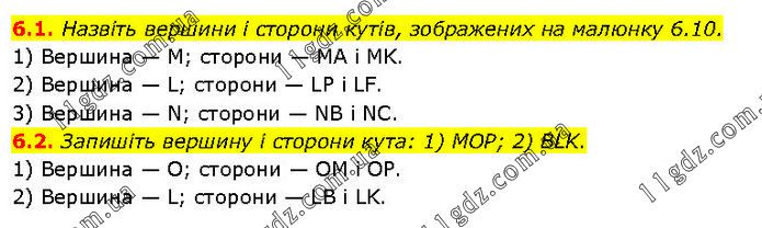 6.1. Назвіть вершини і сторони кутів, зображених на малюнку 6.10. 1) Вершина — М; сторони — MA і MK. 2) Вершина — L; сторони — LP і LF. 3) Вершина — N; сторони — NB і NC. 6.2. Запишіть вершину і сторони кута: 1) МОР; 2) BLK. 1) Вершина — О; сторони — OM і OP. 2) Вершина — L; сторони — LB і LK.