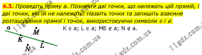 Проведіть пряму а. Позначте дві точки, що належать цій прямій, і дві точки, які їй не належать. Назвіть точки та запишіть взаємне розташування прямої і точок, використовуючи символи ∈ і ∉. К ∈ а; L ∈ а; МЕ ∉ а; N ∉ а.