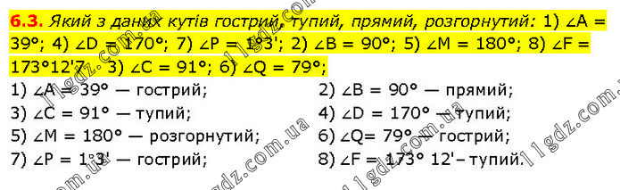 Який з даних кутів гострий, тупий, прямий, розгорнутий: 1) ∠A = 39°; 4) ∠D = 170°; 7) ∠P = 1°3'; 2) ∠B = 90°; 5) ∠M = 180°; 8) ∠F = 173°12'7 3) ∠C = 91°; 6) ∠Q = 79°; 1) ∠A = 39° — гострий; 3) ∠C = 91° — тупий; 5) ∠M = 180° — розгорнутий; 7) ∠P = 1°3' — гострий; 2) ∠B = 90° — прямий; 4) ∠D = 170° — тупий; 6) ∠Q= 79° — гострий; 8) ∠F = 173° 12'– тупий.