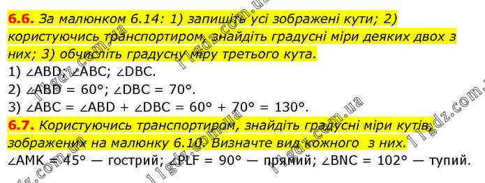 6.6. За малюнком 6.14: 1) запишіть усі зображені кути; 2) користуючись транспортиром, знайдіть градусні міри деяких двох з них; 3) обчисліть градусну міру третього кута. 1) ∠ABD; ∠ABC; ∠DBC. 2) ∠ABD = 60°; ∠DBC = 70°. 3) ∠ABC = ∠ABD + ∠DBC = 60° + 70° = 130°. 6.7. Користуючись транспортиром, знайдіть градусні міри кутів, зображених на малюнку 6.10. Визначте вид кожного з них. ∠AMK = 45° — гострий; ∠PLF = 90° — прямий; ∠BNC = 102° — тупий.