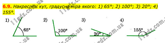Накресліть кут, градусна міра якого: 1) 65°; 2) 100°; 3) 20°; 4) 155°.