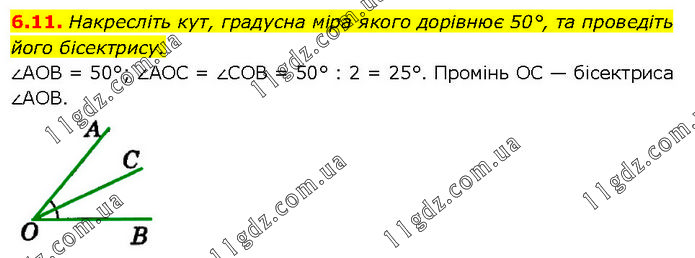 Накресліть кут, градусна міра якого дорівнює 50°, та проведіть його бісектрису. ∠AOB = 50°; ∠AOC = ∠COB = 50° : 2 = 25°. Промінь OC — бісектриса ∠AOB.