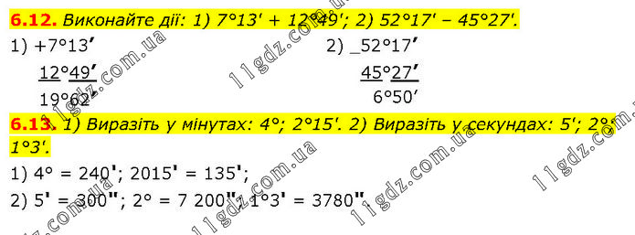 6.12. Виконайте дії: 1) 7°13' + 12°49'; 2) 52°17' – 45°27'. 1) +7°13’ 12°49’ 19°62’ 2) _52°17’ 45°27’ 6°50’ 6.13. 1) Виразіть у мінутах: 4°; 2°15'. 2) Виразіть у секундах: 5'; 2°; 1°3'. 1) 4° = 240'; 2015' = 135'; 2) 5' = 300"; 2° = 7 200"; 1°3' = 3780".