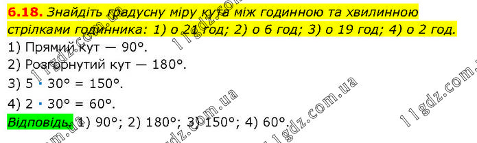 Знайдіть градусну міру кута між годинною та хвилинною стрілками годинника: 1) о 21 год; 2) о 6 год; 3) о 19 год; 4) о 2 год. 1) Прямий кут — 90°. 2) Розгорнутий кут — 180°. 3) 5 ∙ 30° = 150°. 4) 2 ∙ 30° = 60°. Відповідь. 1) 90°; 2) 180°; 3) 150°; 4) 60°.