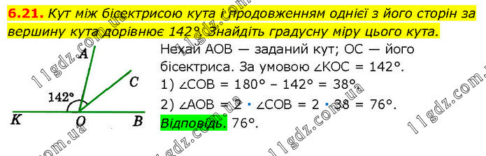 Кут між бісектрисою кута і продовженням однієї з його сторін за вершину кута дорівнює 142°. Знайдіть градусну міру цього кута. Нехай AOB — заданий кут; OC — його бісектриса. За умовою ∠KOC = 142°. 1) ∠COB = 180° – 142° = 38°. 2) ∠АОВ = 2 ∙ ∠СОВ = 2 ∙ 38 = 76°. Відповідь. 76°.