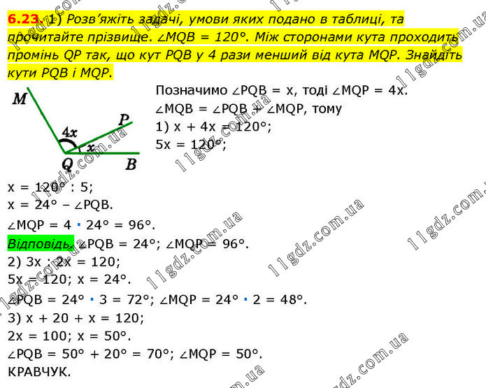 1) Розв’яжіть задачі, умови яких подано в таблиці, та прочитайте прізвище. ∠MQB = 120°. Між сторонами кута проходить промінь QP так, що кут PQB у 4 рази менший від кута MQP. Знайдіть кути PQB і MQP. Позначимо ∠PQB = х, тоді ∠MQP = 4х. ∠MQB = ∠PQB + ∠MQP, тому 1) х + 4х = 120°; 5х = 120°; х = 120° : 5; х = 24° – ∠PQB. ∠MQP = 4 ∙ 24° = 96°. Відповідь. ∠PQB = 24°; ∠MQP = 96°. 2) 3х : 2х = 120; 5х = 120; х = 24°. ∠PQB = 24° ∙ 3 = 72°; ∠MQP = 24° ∙ 2 = 48°. 3) х + 20 + х = 120; 2х = 100; х = 50°. ∠PQB = 50° + 20° = 70°; ∠MQP = 50°. КРАВЧУК.