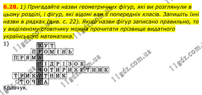 1) Пригадайте назви геометричних фігур, які ви розглянули в цьому розділі, і фігур, які відомі вам з попередніх класів. Запишіть їхні назви в рядках (див. с. 22). Якщо назви фігур записано правильно, то у виділеному стовпчику можна прочитати прізвище видатного українського математика. 1) Кравчук.