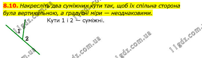 Накресліть два суміжних кути так, щоб їх спільна сторона була вертикальною, а градусні міри — неоднаковими. Кути 1 і 2 — суміжні.