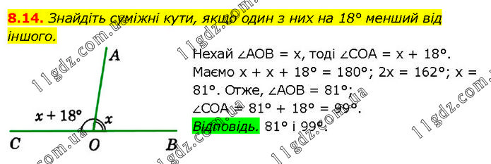 Знайдіть суміжні кути, якщо один з них на 18° менший від іншого. Нехай ∠AOB = х, тоді ∠COA = х + 18°. Маємо х + х + 18° = 180°; 2х = 162°; х = 81°. Отже, ∠AOB = 81°; ∠COA = 81° + 18° = 99°. Відповідь. 81° і 99°.