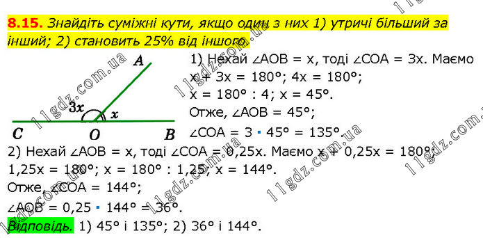 Знайдіть суміжні кути, якщо один з них 1) утричі більший за інший; 2) становить 25% від іншого. 1) Нехай ∠AOB = х, тоді ∠COA = Зх. Маємо х + Зх = 180°; 4х = 180°; х = 180° : 4; х = 45°. Отже, ∠AOB = 45°; ∠COA = 3 ∙ 45° = 135°. 2) Нехай ∠AOB = х, тоді ∠COA = 0,25х. Маємо х + 0,25х = 180°; 1,25х = 180°; х = 180° : 1,25; х = 144°. Отже, ∠СОА = 144°; ∠АОВ = 0,25 ∙ 144° = 36°. Відповідь. 1) 45° і 135°; 2) 36° і 144°.