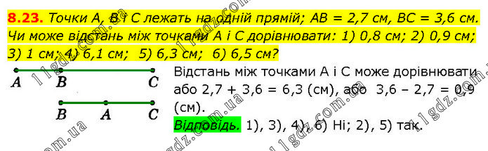 Точки А, В і C лежать на одній прямій; AB = 2,7 см, BC = 3,6 см. Чи може відстань між точками А і C дорівнювати: 1) 0,8 см; 2) 0,9 см; 3) 1 см; 4) 6,1 см; 5) 6,3 см; 6) 6,5 см? Відстань між точками A і C може дорівнювати або 2,7 + 3,6 = 6,3 (см), або 3,6 – 2,7 = 0,9 (см). Відповідь. 1), 3), 4), 6) Ні; 2), 5) так.