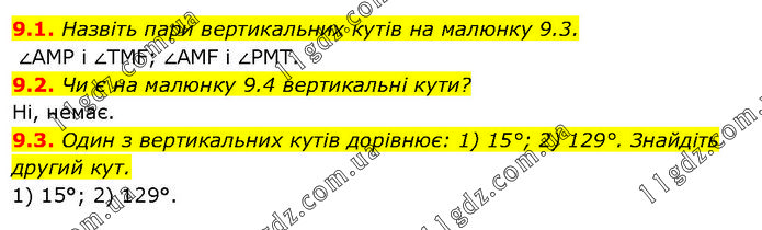 9.1. Назвіть пари вертикальних кутів на малюнку 9.3. ∠AMP і ∠TMF; ∠AMF і ∠PMT. 9.2. Чи є на малюнку 9.4 вертикальні кути? Ні, немає. 9.3. Один з вертикальних кутів дорівнює: 1) 15°; 2) 129°. Знайдіть другий кут. 1) 15°; 2) 129°.