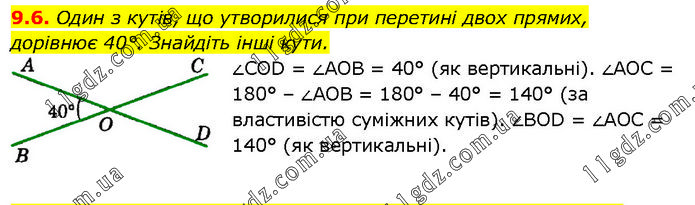 Один з кутів, що утворилися при перетині двох прямих, дорівнює 40°. Знайдіть інші кути. ∠COD = ∠AOB = 40° (як вертикальні). ∠AOC = 180° – ∠AOB = 180° – 40° = 140° (за властивістю суміжних кутів). ∠BOD = ∠AOC = 140° (як вертикальні).