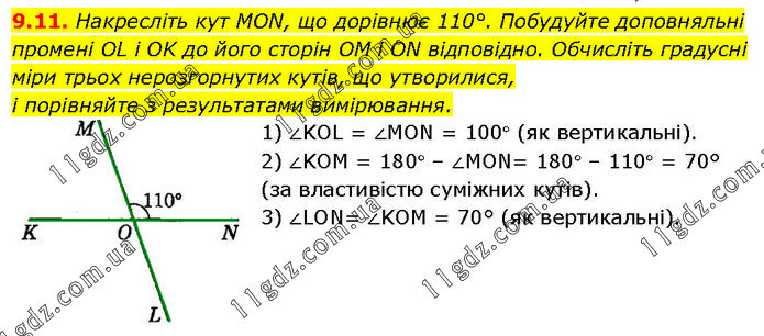 Накресліть кут MON, що дорівнює 110°. Побудуйте доповняльні промені OL і OK до його сторін OM і ON відповідно. Обчисліть градусні міри трьох нерозгорнутих кутів, що утворилися, і порівняйте з результатами вимірювання. 1) ∠KOL = ∠MON = 100° (як вертикальні). 2) ∠KOM = 180° – ∠MON= 180° – 110° = 70° (за властивістю суміжних кутів). 3) ∠LON= ∠KOM = 70° (як вертикальні).