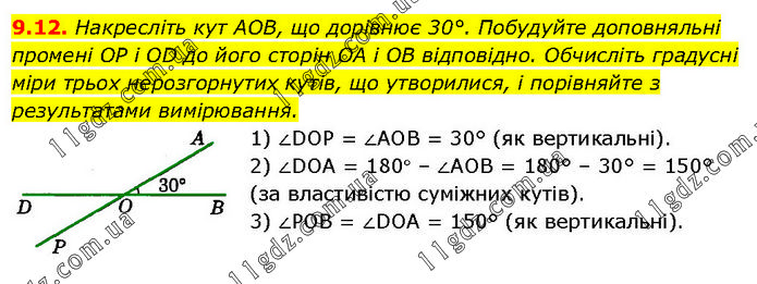 Накресліть кут AOB, що дорівнює 30°. Побудуйте доповняльні промені OP і OD до його сторін OA і OB відповідно. Обчисліть градусні міри трьох нерозгорнутих кутів, що утворилися, і порівняйте з результатами вимірювання. 1) ∠DOP = ∠AOB = 30° (як вертикальні). 2) ∠DOA = 180° – ∠AOB = 180° – 30° = 150° (за властивістю суміжних кутів). 3) ∠POB = ∠DOA = 150° (як вертикальні).