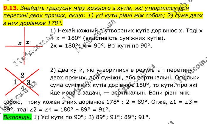 Знайдіть градусну міру кожного з кутів, які утворилися при перетині двох прямих, якщо: 1) усі кути рівні між собою; 2) сума двох з них дорівнює 178°. 1) Нехай кожний з утворених кутів дорівнює х. Тоді х + х = 180° (властивість суміжних кутів). 2х = 180°; х = 90°. Всі кути по 90°. 2) Два кути, які утворилися в результаті перетину двох прямих, або суміжні, або вертикальні. Оскільки сума суміжних кутів дорівнює 180°, то кути, про які йде мова в задачі, — вертикальні. Вони рівні між собою, і тому кожен з них дорівнює 178° : 2 = 89°. Отже, ∠1 = ∠3 = 89°, тоді ∠2 = ∠4 = 180° – 89° = 91°. Відповідь. 1) Усі кути по 90°; 2) 89°; 91°; 89°; 91°.