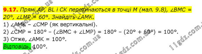 Прямі АР, BL і CK перетинаються в точці М (мал. 9.8), ∠BMC = 20°, ∠LMP = 60°. Знайдіть ∠AMK. 1) ∠AMK – ∠CMP (як вертикальні). 2) ∠CMP = 180° – (∠BMC + ∠LMP) = 180° – (20° + 60°) = 100°. 3) Отже, ∠AMK = 100°. Відповідь. 100°.