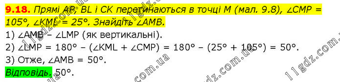 Прямі АР, BL і CK перетинаються в точці М (мал. 9.8), ∠CMP = 105°, ∠KML = 25°. Знайдіть ∠AMB. 1) ∠AMB – ∠LMP (як вертикальні). 2) ∠LMP = 180° – (∠KML + ∠CMP) = 180° – (25° + 105°) = 50°. 3) Отже, ∠AMB = 50°. Відповідь. 50°.