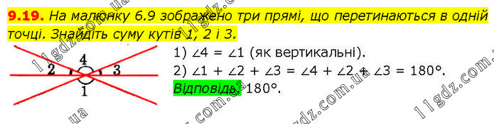 На малюнку 6.9 зображено три прямі, що перетинаються в одній точці. Знайдіть суму кутів 1, 2 і 3. 1) ∠4 = ∠1 (як вертикальні). 2) ∠1 + ∠2 + ∠3 = ∠4 + ∠2 + ∠3 = 180°. Відповідь. 180°.