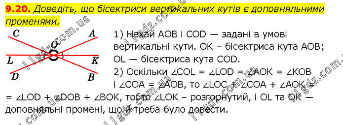 Доведіть, що бісектриси вертикальних кутів є доповняльними променями. 1) Нехай AOB і COD — задані в умові вертикальні кути. OK – бісектриса кута AOB; OL — бісектриса кута COD. 2) Оскільки ∠COL = ∠LOD = ∠AOK = ∠KOB і ∠COA = ∠AOB, то ∠LOC + ∠COA + ∠AOK = = ∠LOD + ∠DOB + ∠BOK, тобто ∠LOK – розгорнутий, і OL та OK — доповняльні промені, що й треба було довести.