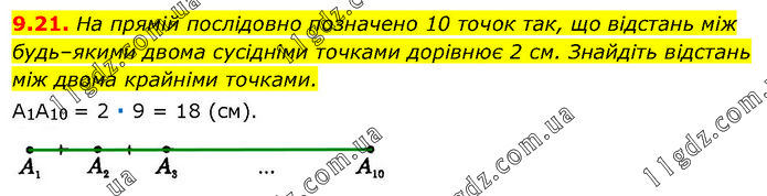 На прямій послідовно позначено 10 точок так, що відстань між будь–якими двома сусідніми точками дорівнює 2 см. Знайдіть відстань між двома крайніми точками. А1А10 = 2 ∙ 9 = 18 (см).