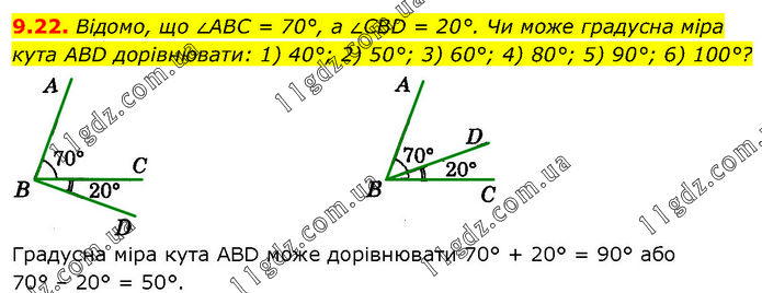 Відомо, що ∠ABC = 70°, a ∠CBD = 20°. Чи може градусна міра кута ABD дорівнювати: 1) 40°; 2) 50°; 3) 60°; 4) 80°; 5) 90°; 6) 100°? Градусна міра кута ABD може дорівнювати 70° + 20° = 90° або 70° – 20° = 50°.
