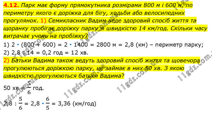 4.12. Парк має форму прямокутника розмірами 800 м і 600 м, по периметру якого є доріжка для бігу, ходьби або велосипедних прогулянок. 1) Семикласник Вадим веде здоровий спосіб життя та щоранку пробігає доріжку парку зі швидкістю 14 км/год. Скільки часу витрачає учень на пробіжку? 1) 2 ∙ (800 + 600) = 2 ∙ 1400 = 2800 м = 2,8 (км) – периметр парку; 2) 2,8 : 14 = 0,2 год = 12 хв. 2) Батьки Вадима також ведуть здоровий спосіб життя та щовечора прогулюються доріжкою парку, це займає в них 50 хв. З якою швидкістю прогулюються батьки Вадима? 50 хв = 5/6 год. 2,8 : 5/6 = 2,8 ∙ 6/5 = 3,36 (км/год)