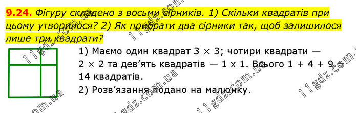 Фігуру складено з восьми сірників. 1) Скільки квадратів при цьому утворилося? 2) Як прибрати два сірники так, щоб залишилося лише три квадрати? 1) Маємо один квадрат 3 × 3; чотири квадрати — 2 × 2 та дев’ять квадратів — 1 x 1. Всього 1 + 4 + 9 = 14 квадратів. 2) Розв’язання подано на малюнку.