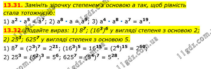 13.31. Замініть зірочку степенем з основою а так, щоб рівність стала тотожністю: 1) a2 ∙ a5 = а7; 2) а8 ∙ а = а9; 3) а4 ∙ а8 ∙ а7 = а19. 13.32. Подайте вираз: 1) 87; (163)6 у вигляді степеня з основою 2; 2) 253; 6257 у вигляді степеня з основою 5. 1) 87 = (23)7 = 221; (163)5 = 1615 = (24)15 = 260; 2) 253 = (52)3 = 56; 6257 = (54)7 = 528.