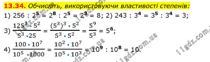 Обчисліть, використовуючи властивості степенів: 1) 256 : 25 = 28 : 25 = 23 = 8; 2) 243 : 34 = 35 : 34 = 3; 3) (125^3 • 5^2)/(5^3 •25) = ((5^3 )^3 • 5^2)/(5^3 • 5^2 ) = 5^9/5^3 = 56; 4) (100 • 10^7)/(10^(5 ) •1000) = (10^2 • 10^7)/(10^5 • 10^3 ) = 109 : 108 = 10.