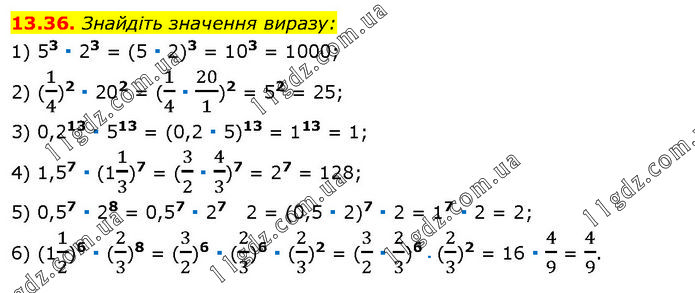 Знайдіть значення виразу: 1) 53 ∙ 23 = (5 ∙ 2)3 = 103 = 1000; 2) (1/4)2 ∙ 202 = (1/4 ∙ 20/1)2 = 52 = 25; 3) 0,213 ∙ 513 = (0,2 ∙ 5)13 = 113 = 1; 4) 1,57 ∙ (11/3)7 = (3/2 ∙ 4/3)7 = 27 = 128; 5) 0,57 ∙ 28 = 0,57 ∙ 27 2 = (0,5 ∙ 2)7 ∙ 2 = 17 ∙ 2 = 2; 6) (11/2)6 ∙ (2/3)8 = (3/2)6 ∙ (2/3)6 ∙ (2/3)2 = (3/2 ∙ 2/3)6 ∙ (2/3)2 = 16 ∙ 4/9 = 4/9.