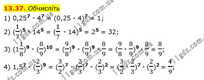 Обчисліть 1) 0,257 ∙ 47 = (0,25 ∙ 4)7 = 1; 2) (1/7)5 ∙ 145 = (1/7 ∙ 14)5 = 25 = 32; 3) (11/8)9 ∙ (8/9)10 = (9/8)9 ∙ (8/9)9 ∙ 8/9 = (9/8 ∙ 8/9)9 ∙ 8/9 = 8/9; 4) 1,57 ∙ (2/3)9 = (3/2)7 ∙ (2/3)7 ∙ (2/3)2 = (3/2 ∙ 2/3)7 ∙ (2/3)2 = 4/9;