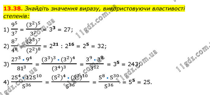Знайдіть значення виразу, використовуючи властивості степенів: 1) 9^5/3^7 = ((3^2 )^5)/3^7 = 33 = 27; 2) 8^7/4^8 = ((2^3 )^7)/((2^2 )^8 ) = 221 : 216 = 25 = 32; 3) (27^3 • 9^4)/81^3 = ((3^3 )^3 • (3^2 )^4 )/((3^4 )^3 ) = (3^9 • 3^8)/3^12 = 35 = 243; 4) (25^4 • 125^10)/5^36 = ((5^2 )^4 • (5^3 )^10 )/5^36 = (5^8 • 5^30)/5^36 = 55 = 25.