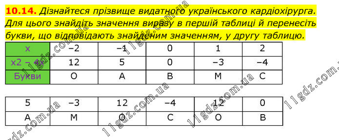 Дізнайтеся прізвище видатного українського кардіохірурга. Для цього знайдіть значення виразу в першій таблиці й перенесіть букви, що відповідають знайденим значенням, у другу таблицю.