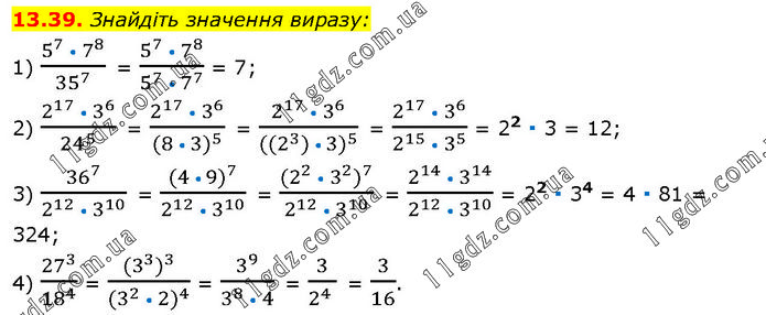 Знайдіть значення виразу: 1) (5^7 • 7^8)/35^7 = (5^7 • 7^8)/(5^7 • 7^7 ) = 7; 2) (2^17 • 3^6)/24^5 = (2^17 • 3^6)/〖(8 • 3)〗^5 = (2^17 • 3^6)/〖((2^3) • 3)〗^5 = (2^17 • 3^6)/(2^15 • 3^5 ) = 22 ∙ 3 = 12; 3) 36^7/(2^12 • 3^10 ) = 〖(4 • 9)〗^7/(2^12 • 3^10 ) = 〖(2^2 • 3^2)〗^7/(2^12 • 3^10 ) = (2^14 • 3^14)/(2^12 • 3^10 ) = 22 ∙ 34 = 4 ∙ 81 = 324; 4) 27^3/18^4 = ((3^3 )^3)/((3^2 • 2)^4 ) = 3^9/(3^8 • 4) = 3/(2^4 ) = 3/16.