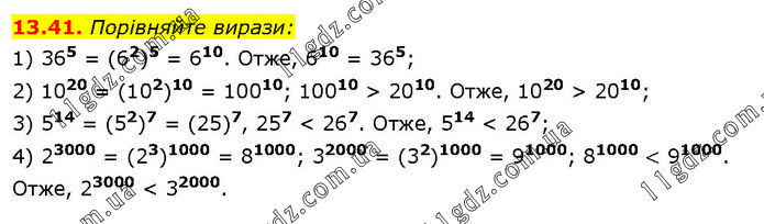 Порівняйте вирази: 1) 365 = (62)5 = 610. Отже, 610 = 365; 2) 1020 = (102)10 = 10010; 10010 > 2010. Отже, 1020 > 2010; 3) 514 = (52)7 = (25)7, 257 < 267. Отже, 514 < 267; 4) 23000 = (23)1000 = 81000; 32000 = (32)1000 = 91000; 81000 < 91000. Отже, 23000 < 32000.