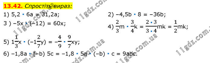 Спростіть вираз: 1) 5,2 ∙ 6а = 31,2а; 3 ) –5х ∙ (–12) = 60х; 2) –4,5b ∙ 8 = –36b; 4) 2/3m ∙ 3/4k = (2 • 3)/(3 • 4)mk = 1/2mk; 5) 11/3x ∙ (–12/7y) = –4/9 ∙ 9/7xy; 6) –1,8а ∙ (–b) 5с = –1,8 ∙ 5а ∙ (–b) ∙ с = 9abc.