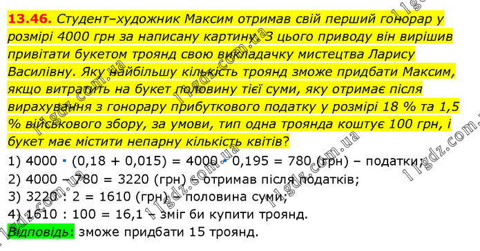 Студент–художник Максим отримав свій перший гонорар у розмірі 4000 грн за написану картину. З цього приводу він вирішив привітати букетом троянд свою викладачку мистецтва Ларису Василівну. Яку найбільшу кількість троянд зможе придбати Максим, якщо витратить на букет половину тієї суми, яку отримає після вирахування з гонорару прибуткового податку у розмірі 18 % та 1,5 % військового збору, за умови, тип одна троянда коштує 100 грн, і букет має містити непарну кількість квітів? 1) 4000 ∙ (0,18 + 0,015) = 4000 ∙ 0,195 = 780 (грн) – податки; 2) 4000 – 780 = 3220 (грн) – отримав після податків; 3) 3220 : 2 = 1610 (грн) – половина суми; 4) 1610 : 100 = 16,1 – зміг би купити троянд. Відповідь: зможе придбати 15 троянд.