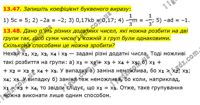 13.47. Запишіть коефіцієнт буквеного виразу: 1) 5с = 5; 2) –2а = –2; 3) 0,17kb = 0,17; 4) –1/3m = –1/3; 5) –ad = –1. 13.48. Дано п’ять різних додатних чисел, які можна розбити на дві групи так, щоб суми чисел у кожній з груп були однаковими. Скількома способами це можна зробити? Нехай x1, x2, x3, x4 і x5 — задані різні додатні числа. Тоді можливі такі розбиття на групи: а) х1 = х2 + x3 + х4 + x5; б) x1 + + х2 = х3 + x4 + х5. У випадку а) заміна неможлива, бо x1 > x2; х3; х4; x5. У випадку б) заміна теж неможлива, бо коли, наприклад, x1 = x3 + х4, то звідси слідує, що x1 = х5. Отже, таке групування можна виконати лише одним способом.