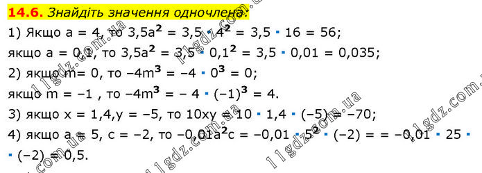 Знайдіть значення одночлена: 1) Якщо a = 4, то 3,5а2 = 3,5 ∙ 42 = 3,5 ∙ 16 = 56; якщо а = 0,1, то 3,5а2 = 3,5 ∙ 0,12 = 3,5 ∙ 0,01 = 0,035; 2) якщо m= 0, то –4m3 = –4 ∙ 03 = 0; якщо m = –1 , то –4m3 = – 4 ∙ (–1)3 = 4. 3) якщо х = 1,4,у = –5, то 10xy = 10 ∙ 1,4 ∙ (–5) = –70; 4) якщо а = 5, с = –2, то –0,01a2c = –0,01 ∙ 52 ∙ (–2) = = –0,01 ∙ 25 ∙ ∙ (–2) = 0,5.