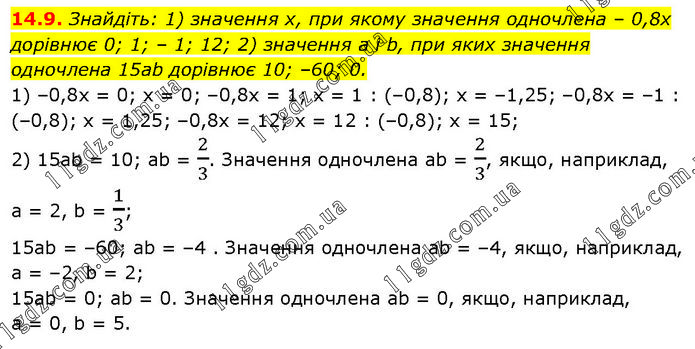 Знайдіть: 1) значення х, при якому значення одночлена – 0,8x дорівнює 0; 1; – 1; 12; 2) значення а і b, при яких значення одночлена 15аb дорівнює 10; –60; 0. 1) –0,8x = 0; х = 0; –0,8х = 1; x = 1 : (–0,8); x = –1,25; –0,8х = –1 : (–0,8); х = 1,25; –0,8x = 12; х = 12 : (–0,8); х = 15; 2) 15ab = 10; ab = 2/3. Значення одночлена ab = 2/3, якщо, наприклад, а = 2, b = 1/3; 15ab = –60; ab = –4 . Значення одночлена ab = –4, якщо, наприклад, а = –2, b = 2; 15ab = 0; ab = 0. Значення одночлена ab = 0, якщо, наприклад, а = 0, b = 5.