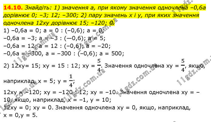 Знайдіть: 1) значення а, при якому значення одночлена –0,6а дорівнює 0; –3; 12; –300; 2) пару значень х і у, при яких значення одночлена 12ху дорівнює 15; –120; 0. 1) –0,6а = 0; а = 0 : (–0,6); а = 0; –0,6а = –3; а = –3 : (—0,6); а = 5; –0,6а = 12; а = 12 : (–0,6); а = –20; –0,6а = –300, а = –300 : (–0,6); а = 500; 2) 12ху= 15; ху = 15 : 12; ху = 5/4. Значення одночлена ху = 5/4, якщо, наприклад, х = 5; у = 1/4; 12ху = –120; ху = –120 : 12; ху = –10. Значення одночлена ху = –10, якщо, наприклад, х = –1, у = 10; 12xy = 0; ху = 0. Значення одночлена ху = 0, якщо, наприклад, х = 0,у = 5.