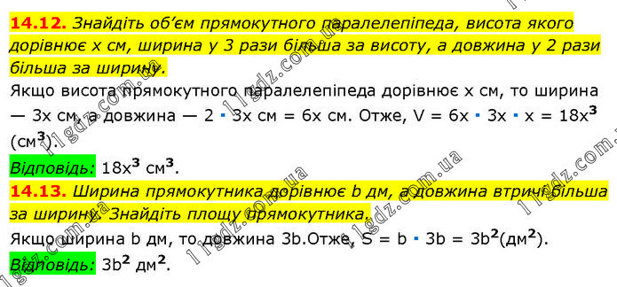 14.12. Знайдіть об’єм прямокутного паралелепіпеда, висота якого дорівнює х см, ширина у 3 рази більша за висоту, а довжина у 2 рази більша за ширину. Якщо висота прямокутного паралелепіпеда дорівнює х см, то ширина — 3х см, а довжина — 2 ∙ 3х см = 6х см. Отже, V = 6х ∙ 3х ∙ х = 18х3 (см3). Відповідь: 18х3 см3. 14.13. Ширина прямокутника дорівнює b дм, а довжина втричі більша за ширину. Знайдіть площу прямокутника. Якщо ширина b дм, то довжина 3b.Отже, S = b ∙ 3b = 3b2(дм2). Відповідь: 3b2 дм2.
