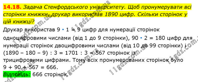 Задача Стенфордського університету. Щоб пронумерувати всі сторінки книжки, друкар використав 1890 цифр. Скільки сторінок у цій книжці? Друкар використав 9 ∙ 1 = 9 цифр для нумерації сторінок одноцифровими числами (від 1 до 9 сторінки), 90 ∙ 2 = 180 цифр для нумерації сторінок двоцифровими числами (від 10 до 99 сторінки) і (1890 – 180 – 9) : 3 = 1701 : 3 = 567 сторінок із трицифровими цифрами. Тому всіх пронумерованих сторінок було 9 + 90 + 567 = 666. Відповідь: 666 сторінок.