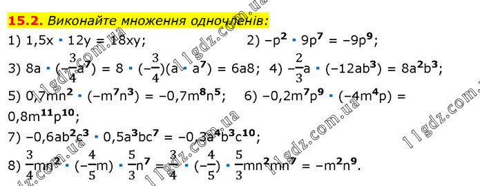 Виконайте множення одночленів: 1) 1,5x ∙ 12у = 18ху; 2) –р2 ∙ 9р7 = –9р9; 3) 8a ∙ (–3/4a7) = 8 ∙ (–3/4)(a ∙ a7) = 6a8; 4) –2/3a ∙ (–12ab3) = 8a2b3; 5) 0,7mn2 ∙ (–m7n3) = –0,7m8n5; 6) –0,2m7p9 ∙ (–4m4p) = 0,8m11p10; 7) –0,6ab2c3 ∙ 0,5a3bc7 = –0,3a4b3c10; 8) 3/4mn2 ∙ (–4/5m) ∙ 5/3n7 = 3/4 ∙ (–4/5) ∙ 5/3mn2mn7 = –m2n9.