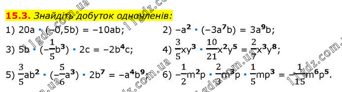 Знайдіть добуток одночленів: 1) 20a ∙ (–0,5b) = –10ab; 3) 5b ∙ (–1/5b3) ∙ 2c = –2b4c; 5) 3/5ab2 ∙ (–5/6a3) ∙ 2b7 = –a4b9; 2) –a2 ∙ (–3a7b) = 3a9b; 4) 3/5xy3 ∙ 10/21x2y5 = 2/7x3y8; 6) –1/2m2p ∙ 2/3m3p ∙ 1/5mp3 = –1/15m6p5.